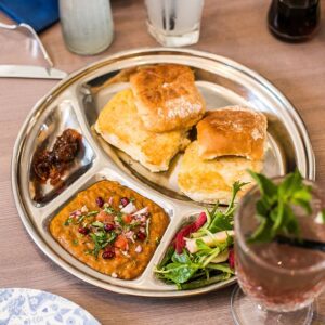 Pan seared sea-bass on a bed of South Indian spiced potatoes covered with a curry jus.